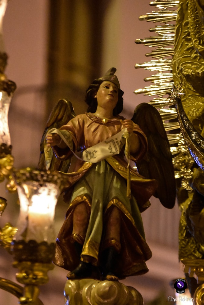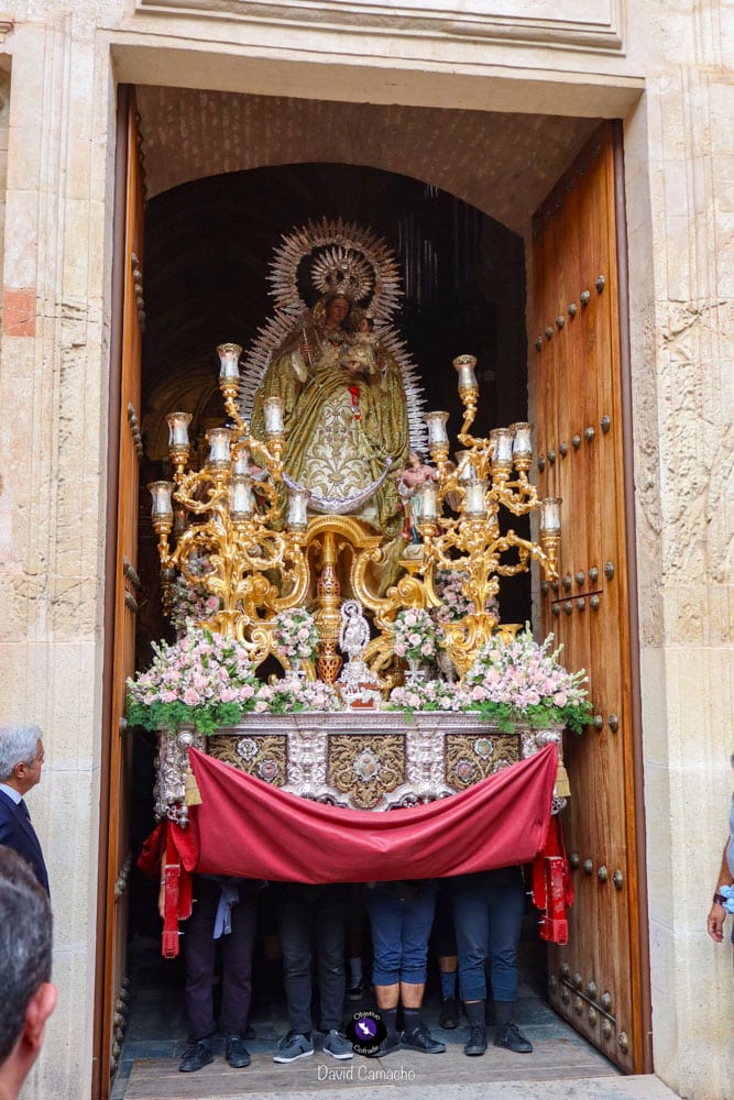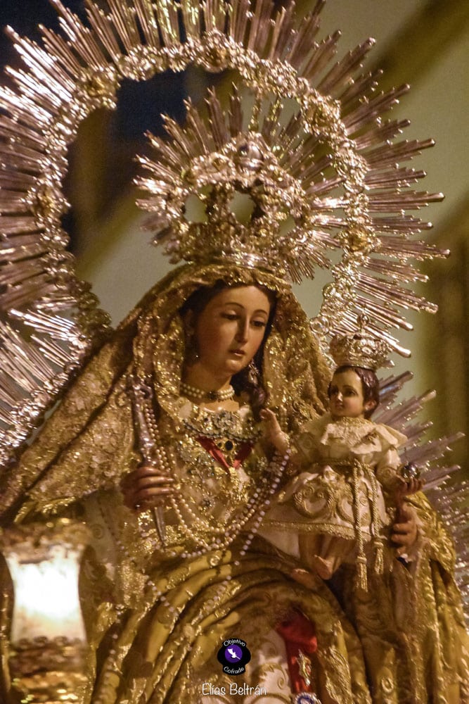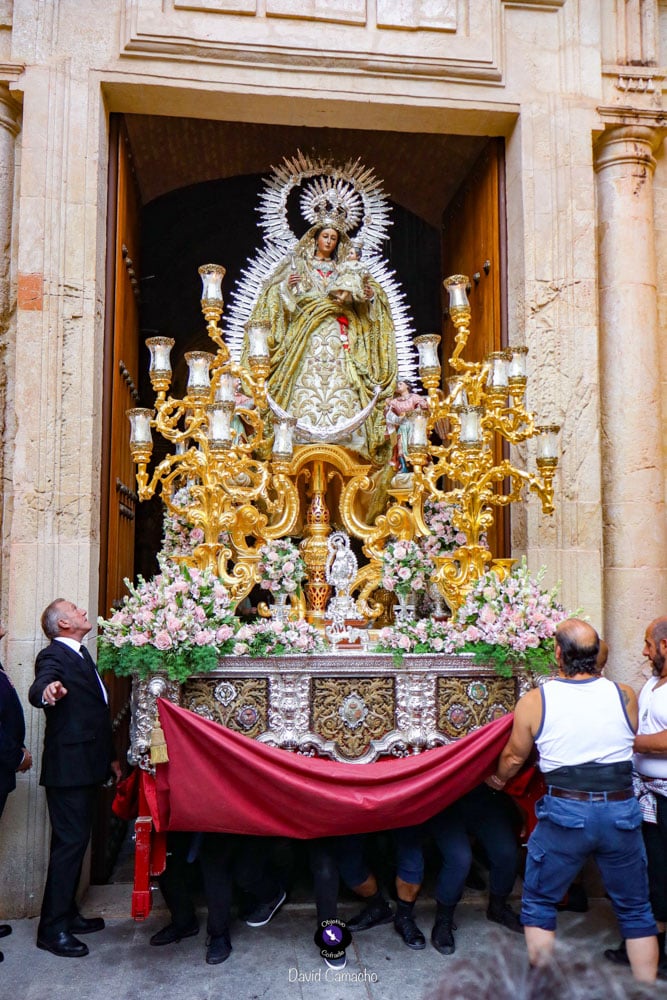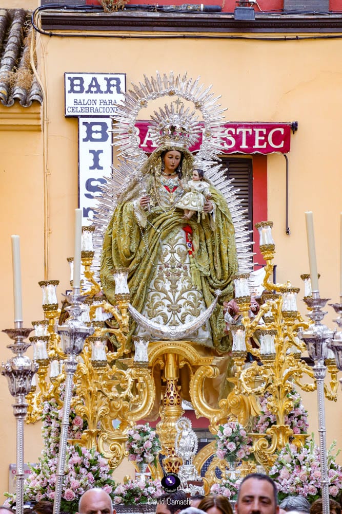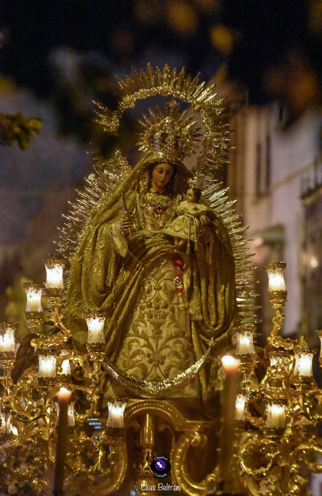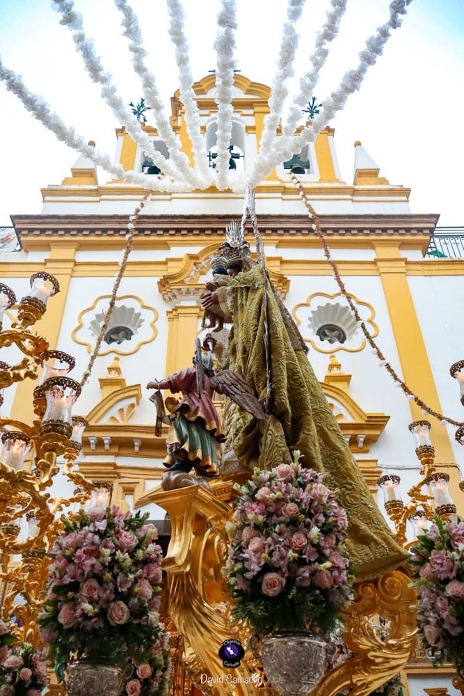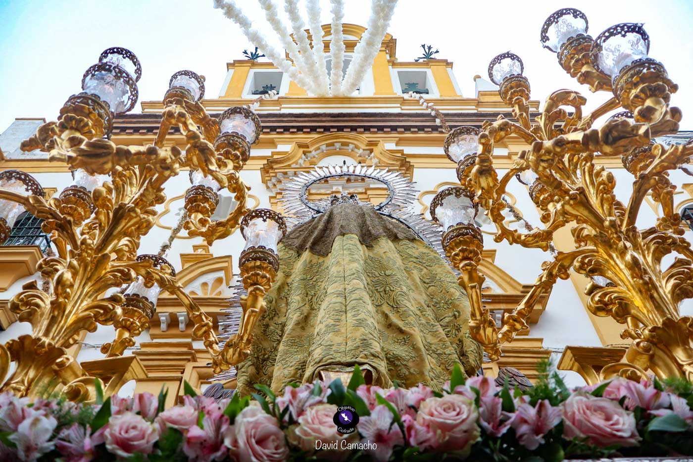 A las 18:30 horas, las puertas de la Real Parroquia de Santa Ana se abrieron, la banda de Cornetas y tambores del Santísimo Cristo de las Tres Caidas abria el cortejo y tras la salida del cortejo el paso cruzó la Plazuela entre aplausos y sones de la Banda de Música del Maestro Tejera, que interpretó el Himno Nacional y un repertorio acorde a cada momento. La Virgen lucía su habitual porte elegante, vestida con saya blanca bordada en oro.