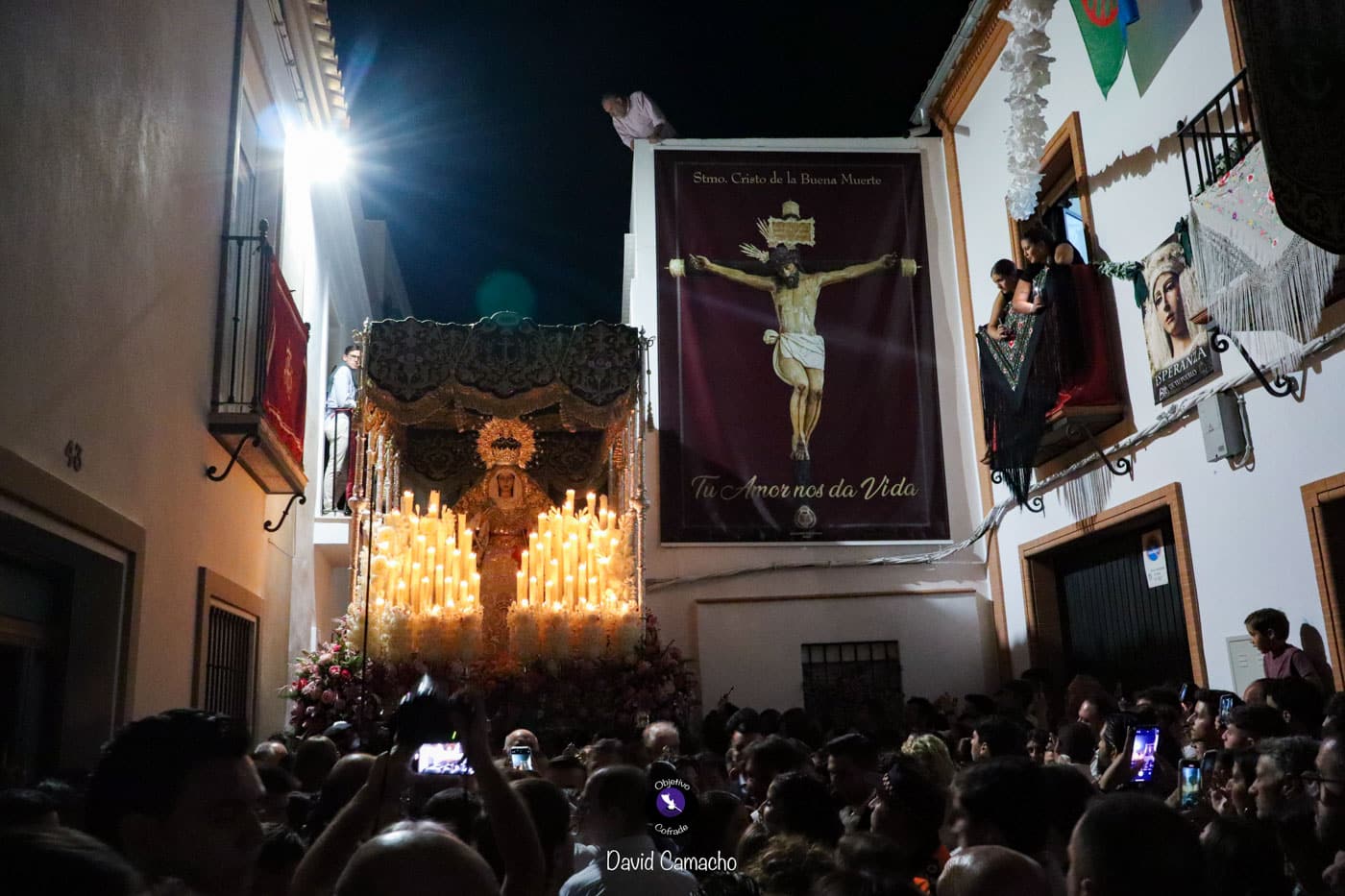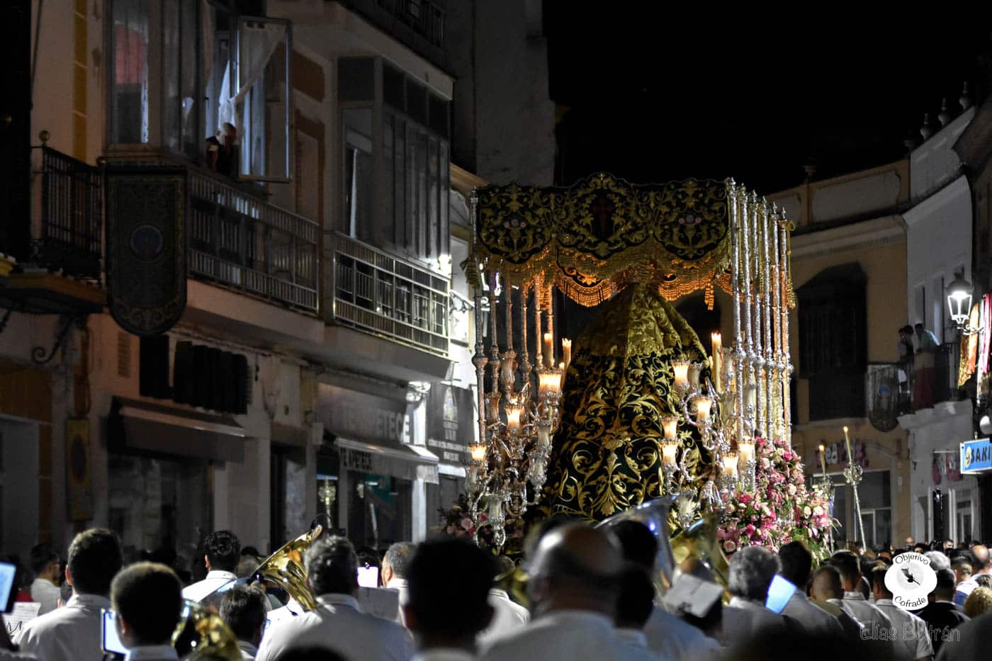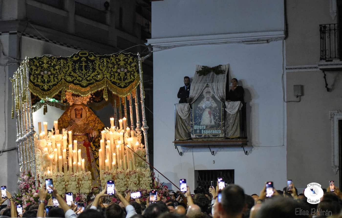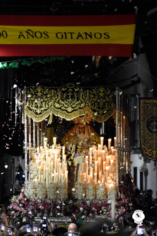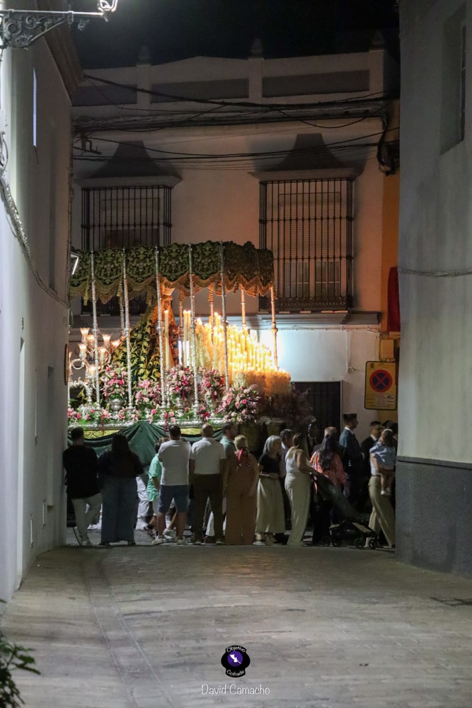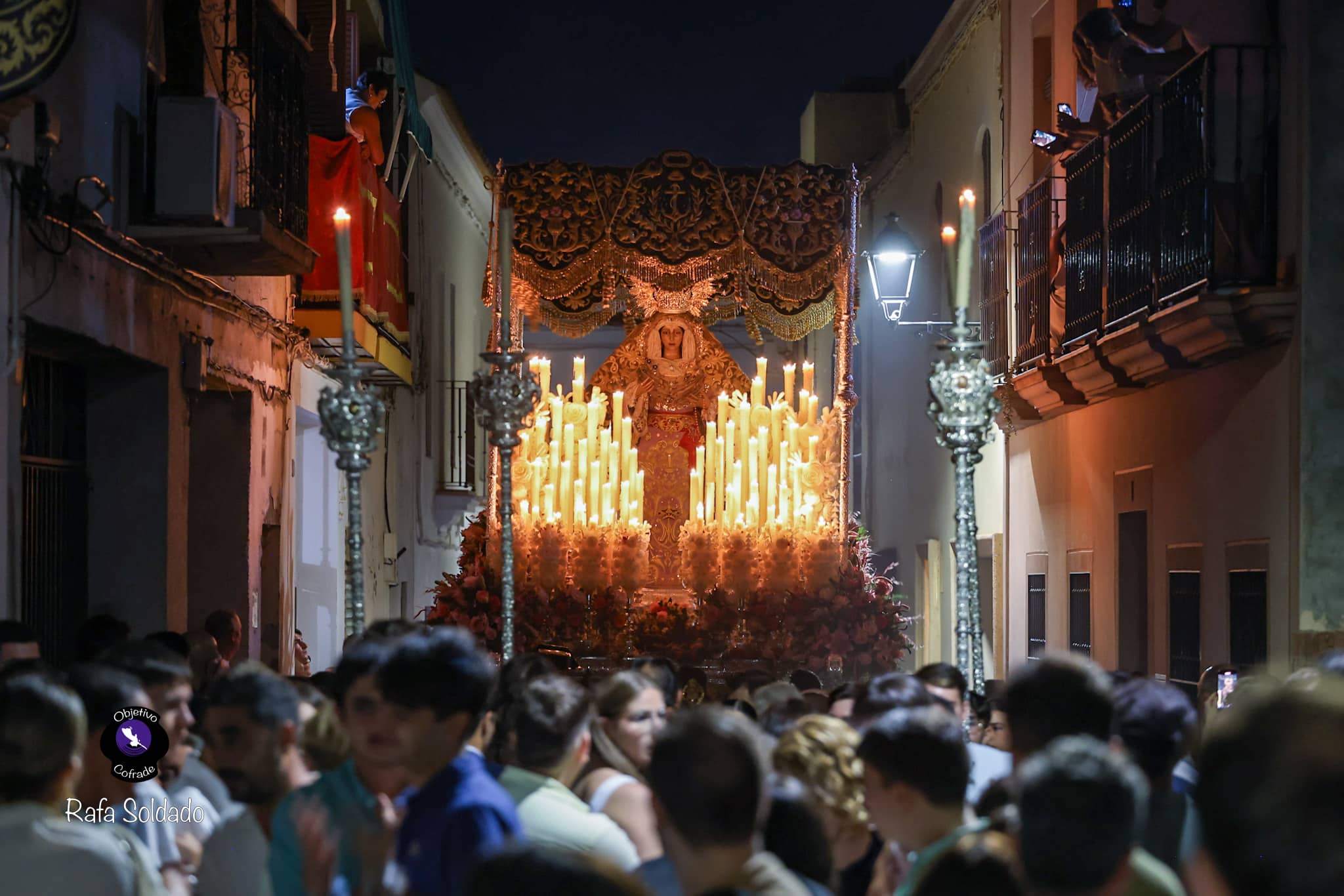 Tras la liturgia, el cortejo emprendió un recorrido de regreso inédito, diseñado para acercar la imagen a barrios de especial significado para la comunidad gitana de Utrera. Calles como Nueva, Fajardo o Lope Díaz fueron escenario de intensos momentos de fe, con petaladas y cánticos gitanos que acompañaron el andar de la Virgen hasta su recogida en Santiago el Mayor, ya entrada la medianoche.